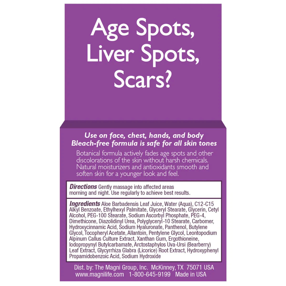 La fórmula clínicamente probada utiliza ingredientes botánicos naturales en lugar de productos químicos agresivos para atenuar las manchas de la edad, las pecas y otras decoloraciones asociadas con la edad.
