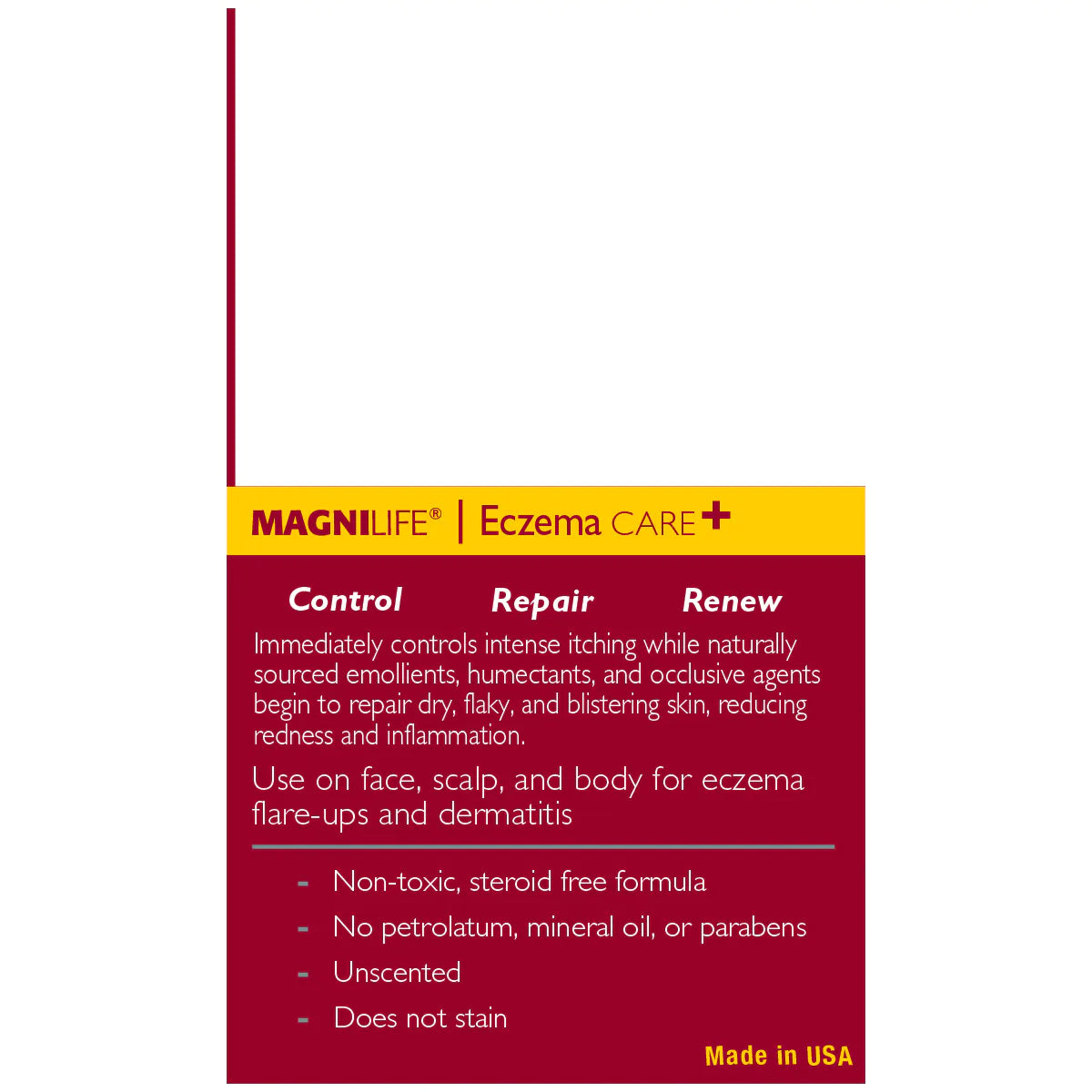 No, Eczema Care+ contains healing ingredients such as Witch Hazel and Aloe Vera that have naturally cooling and soothing powers to provide much needed relief to irritated and flared-up skin.